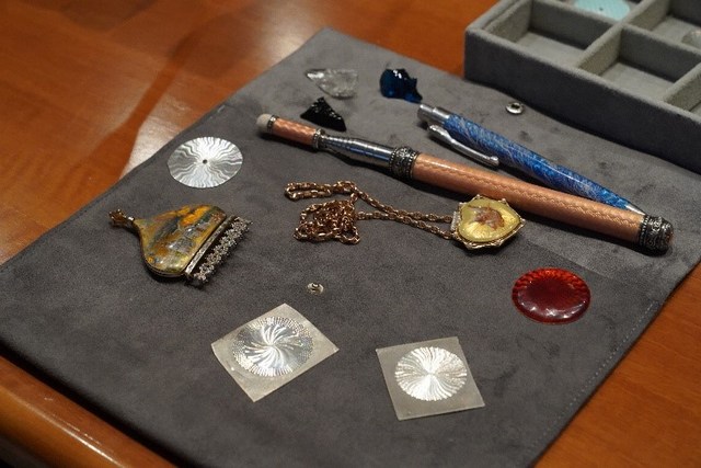 Алексей и Виктория рассказали участникам встречи об использовании декоративно-прикладных техник в ювелирном искусстве, о необычном слиянии двух традиционных техник – лаковой миниатюрной живописи и токарного гильоше, о том, когда и почему узор, нанесенный с помощью орнаментального станка, стал называться «гильоше». Мастера поделились с экспертами Гохрана результатами своей большой исследовательской работы по изучению этого уникального ювелирного направления, рассказав и о технике Vernis Marten, которую придумал искусный французский лакировщик Гийом Мартен, и о достижениях нашего соотечественника Андрея Константиновича Нартова, разработавшего уникальный токарно-копировальный станок с механизированным суппортом, который позволял создавать сложные декоративные рельефы и узоры, помогал добиться высокой точности и повторяемости деталей, а также значительно ускорил процесс производства и автоматизировал труд.